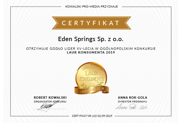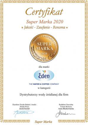 Super Marka to wyróżnienie przyznane przez Konsumentów na podstawie ogólnopolskiego badania pod patronatem i opieką merytoryczną Instytutu Filozofii i Socjologii Polskiej Akademii Nauk. Konsumenci wybrali Eden Springs, jako najlepszą markę, godną zaufania, oferującą dobre jakościowo produkty, w kategorii Dystrybutorzy wody źródlanej dla firm.